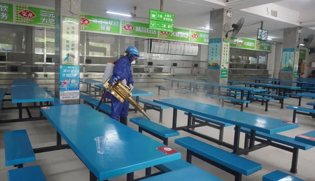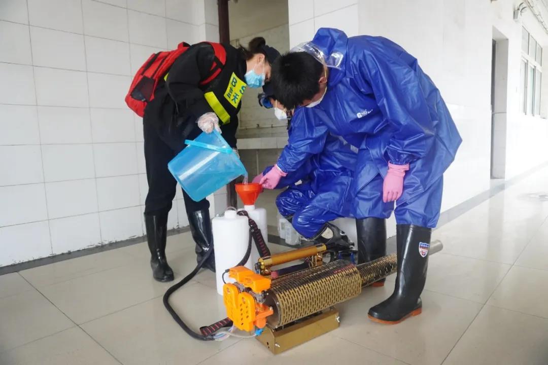 4月22日当天,蓝天救援队的志愿者们携带专业的消毒设备,对学院教学楼、实训区域、师生宿舍、食堂餐厅、图书馆等地方进行了全面消毒,为学院安全开学提供了保障。