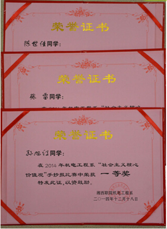 据悉,为了开展好这次比赛,机电工程系在赛前作了广泛的宣传发动工作,在各班的积极参与下,共收集到参赛作品132幅。同时,为了做到比赛的公平、公正,该系还邀请了学院分管学生工作的工会主席陈杨晖、宣传处处长彭继林及本系系主任罗燕担任评委。最终,十四幅主题鲜明、版面设计新颖、图文并茂、色彩搭配合理的作品脱颖而出获得了奖项,其中,13-5高电力1班孙旭红等同学荣获一等奖,14-3高建筑1班的石雪平等同学荣获二等奖。
