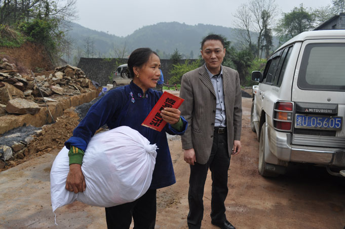 吴炳川怀着感激之情从他们手中接过10015元爱心款和200余件套捐赠衣物。李光寒鼓励吴炳川要战胜困难,积极开展灾后房屋重建,让家人重获温馨家园。