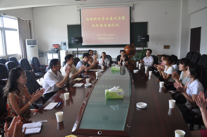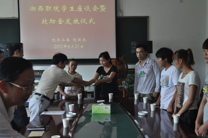2011 年 6 月 21 日 下午4:00在湘西民族职业技术学院三楼会议室隆重举行了学生座谈会暨救助金发放仪式。参加座谈会的有:院党委委员、纪委书记刘修洪同志,院关工委主任李成斌同志,院团委书记田利华同志以及受资助的15名学生。