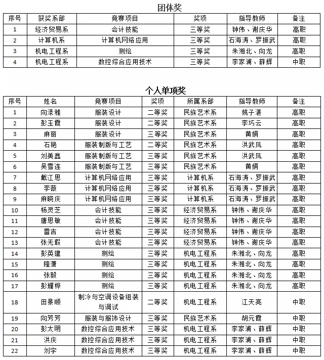 2017年湖南省职业院校技能竞赛于4月28日在长沙民政职院等赛点学校落下帷幕,喜讯不断从各赛点传来:经济贸易系、机电工程系、计算机系等三个系部共获得4项团体奖,向渌雅等22人获得个人单项二、三等奖,民族艺术系学生向渌雅、石艳还将代表湖南省参加全国职业技能竞赛。此次比赛,学院团体奖和个人单项奖均取得了新的突破,现将具体比赛获奖情况通报如下: