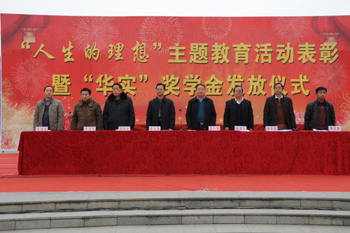 为激励学生刻苦钻研,发奋学习,立志成才,2013年12月10日下午,学院在中心广场隆重举行了“人生理想”教育表彰大会暨“华实奖助学金”发放仪式。学院党委书记吴正有,党委副书记、院长李光寒,副院长杨建平,院关工委副主任胡和生等领导出席大会。学生处处长单新德主持大会。