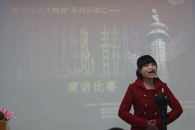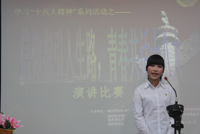 在全国上下掀起学习贯彻十八大精神热潮之际,我湘西职院青年学生不甘落后。12月5日下午,由经贸系党支部、院团委、思政部、经贸系关工委共同主办,经贸系团部支、学生会承办的经贸系“信仰指引人生路,青春共话十八大”演讲比赛正式拉开帷幕。
