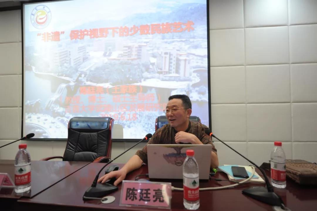 陈廷亮教授从非物质文化遗产的起源、释义及保护意义,国内外非物质文化遗产保护的相关情况,以及在非遗保护视野下土家族文化艺术的现状和利用情况等方面,全面系统地向师生们讲授了非遗知识,生动形象地让师生们感受到了土家族文化艺术的魅力。讲座现场不时响起阵阵掌声,精彩的讲座也引发了师生们对少数民族文化保护和传承的认真思考。