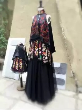 9月21日,在山东济南举办的第四届中国非物质文化遗产博览会上,一件精美绝伦的高端定制礼服吸引了游客的目光。该作品以黑色作底,服装正反面用古朴艳丽的苗绣工艺手工绣制了以龙凤造型为主的大量繁复漂亮的图案。这件高端定制的礼服是由北京木真了公司设计,图案部分设计与手工绣制由湘西职院民族艺术系教师和13-5工艺美术班学生共同完成。这也标志着我院与北京木真了公司的校企合作,绘制出了非遗传承创新的现代新篇。