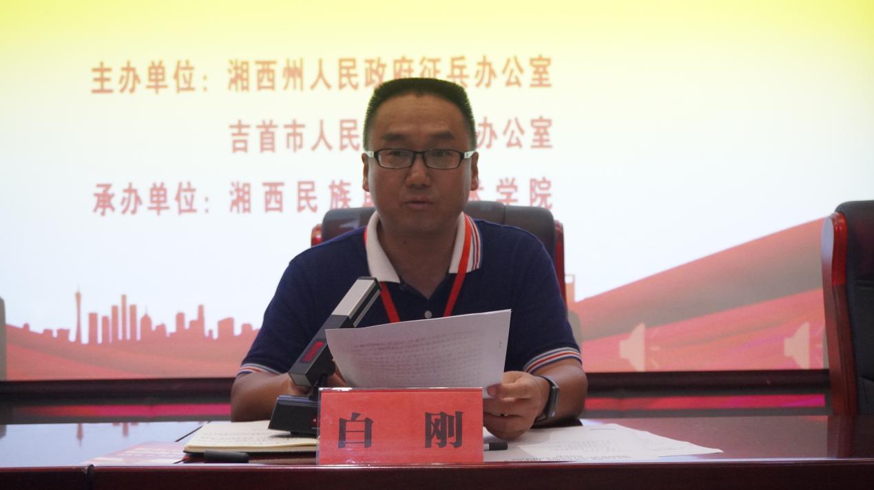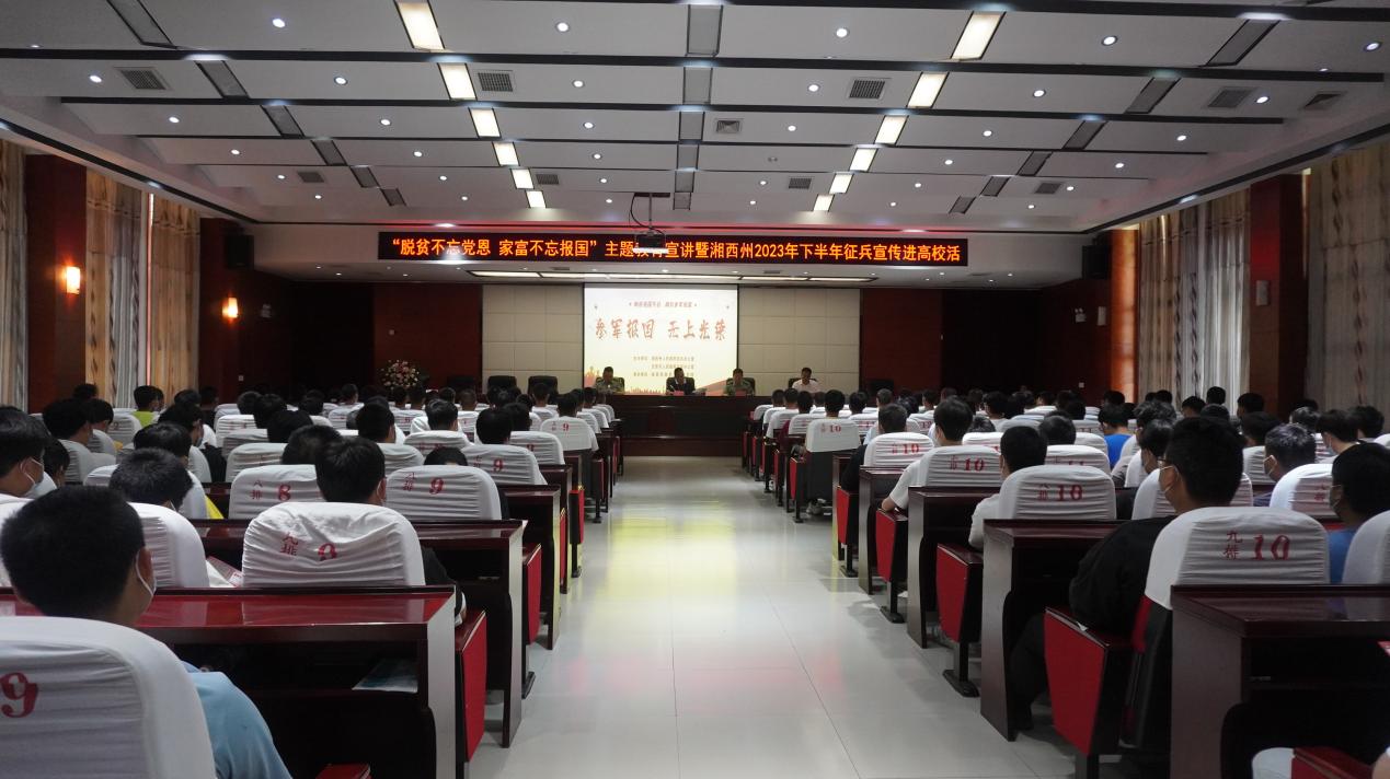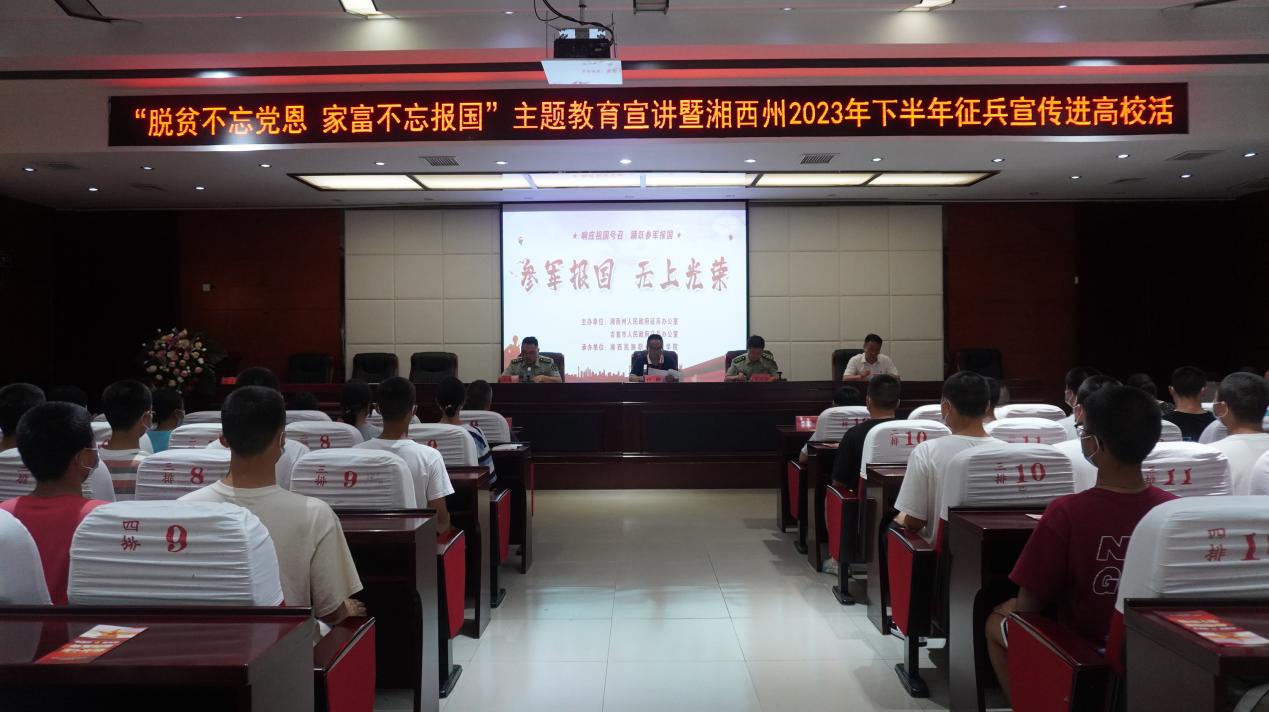 6月20日下午,湘西州人民政府征兵办公室、吉首市人民政府征兵办公室联合湘西职院在学院D区报告厅举行“脱贫不忘党恩 家富不忘报国”主题教育宣讲暨湘西州2023年秋季征兵宣传进高校活动。学院党委委员、副院长白刚,州征兵办主任、州军分区动员处处长林庆根上校,吉首市人武部部长彭炎林,学院保卫处处长田利华出席活动。