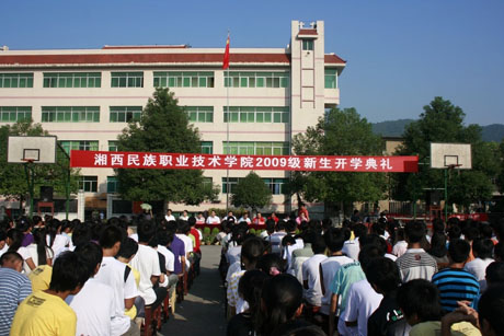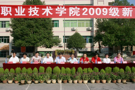 丹桂飘香,金秋送爽, 8月19日上午,学院分别在南校区及技工学校校区同时举行了2009级初中起点新生开学典礼。在庄严的国歌声中,开学典礼拉开了帷幕。会上,学院领导介绍了学校的发展情况,并对学生的在校学习生活提出了几点殷切希望,希望同学们努力提高自身思想政治素质,努力提高自身专业技能,努力提高自我管理能力,努力培养主人翁精神。与会的教师代表、学生及新生代表均作了热情洋溢的发言,学生处老师就开学期间入学教育、军训等事宜作了具体安排。学院领导龚光耀、李成斌、宋清华、杨建平、陈杨晖、曾文光等在主席台上就座,各系主任及部分处室负责人参加了会议。