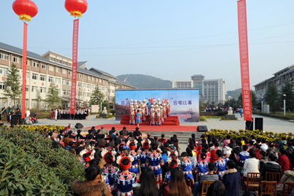 12月3日下午,由旅游管理系主办的“梦里湘西”合唱赛在学院中心广场举行。学院党委书记吴正有,党委副书记、院长李光寒,党委副书记曹义文,副院长罗红、符华西等学院领导出席现场并观看比赛。州旅游局副局长彭秀金、吉首市外事办主任扶卫平,以及湘西民族宾馆总经理李国浩、湘西之旅国际旅行社总经理王敏、湘西山水国际旅行社总经理饶维强等企业代表受邀观看比赛。