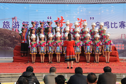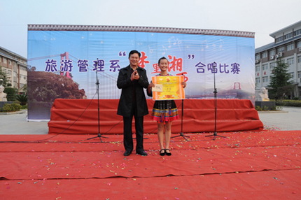 十一支参赛代表队身着艳丽的民族服饰,精神饱满,斗志昂扬。《玛汝啊莱秋》、《湘西酒歌》、《苗岭连北京》……,一曲曲音律优美动听、节奏明快流畅的湘西民歌在校园接连唱响。参赛队伍的倾心演唱,巧妙灵动的队形变化以及美妙和声为现场观众带来绝佳的视听享受,赢得了阵阵热烈的掌声。在比赛统分阶段,旅游管理系领导、科任教师、班主任合唱的《湘西是我家》、《赶秋》,以及贺昌兴老师演唱的《美丽凤凰》再次掀起高潮,观众席掌声雷动,现场顿时成为一片欢乐的海洋。最后,主持人宣布比赛结果:12-3高旅1班荣获一等奖,10-5高旅2班、13中酒店1班荣获二等奖,13-5高旅1班、12中酒店1班 、13中烹饪1班荣获三等奖。