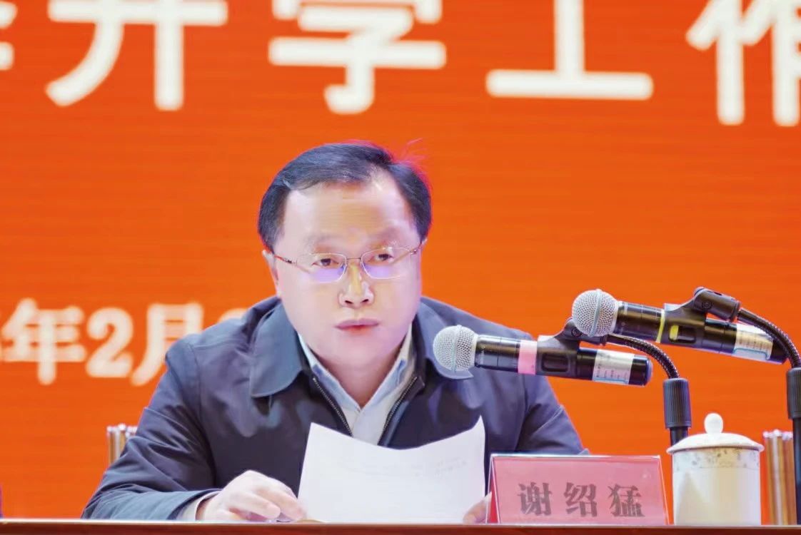 谢绍猛强调,新时代新征程,全校上下要深入学习贯彻全国、全省教育大会精神,贯彻落实《教育强国建设规划纲要(2024—2035年)》部署要求,把准政策形势,明确发展目标,厘清工作思路,在现代职业教育体系建设改革中找准发展方向和路径;要锚定发展目标、创新工作举措,围绕“1311”工作思路,强化党建引领作用、推进专业优化提质、加强师资队伍建设、提高综合育人水平、深化产教融合发展、提升招生就业质量、夯实办学基础条件、注重民生实事保障、加强宣传文化建设、维护校园安全稳定、增强科教服务能力,推动学校工作提质增效、晋档升级。