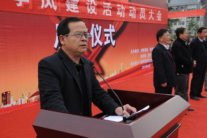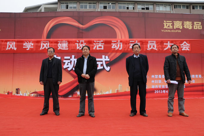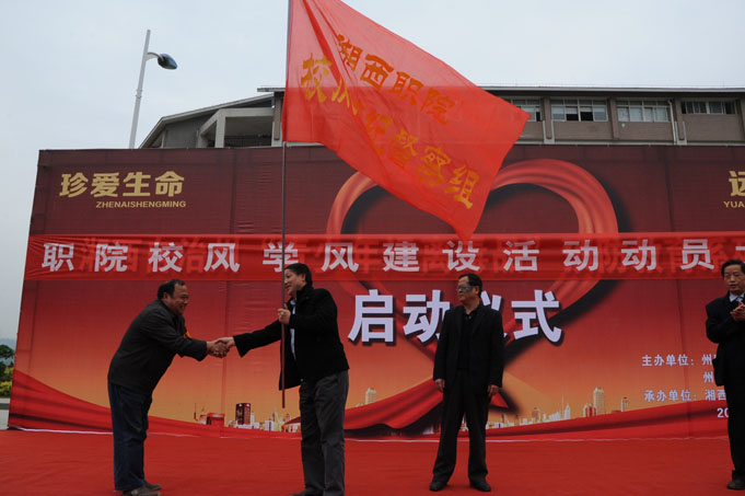 会上,学生处处长单新德宣读了《2013年湘西职院校风学风建设活动方案》。学生代表吕爱霞就校风学风建设在大会上向全院学生发出倡议。胡和生副主任宣读了《湘西职院成立校风校纪督察组的决定》。宣读完文件后,出席大会的学院领导分别为校风校纪督察组、文明卫生监督岗授旗、授牌。