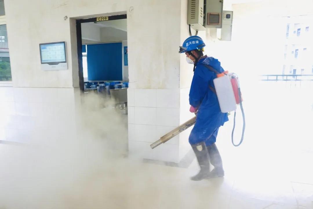 在学生食堂,防疫人员正在进行食堂的日常消杀处理。“疫情期间,我们对食堂和餐具严格消毒,保持通风干燥。同时采用取餐制度,以班为单位分散用餐,确保师生员工用餐安全。”后勤管理处副处长黄劲松介绍说。