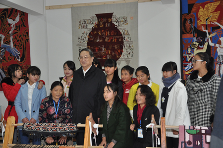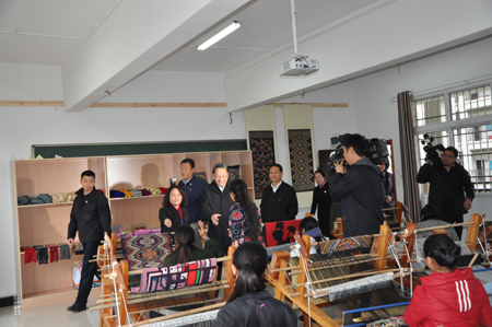 【场景一】:俞正声脸上挂着亲切的微笑,走进了土家织锦工作室。“爷爷好”,正在织锦的同学们齐声喊道,“爷爷,下午好,我能跟你说句话吗?”来自15—5高旅游工艺品一班的曹雅洁站起来说道。“当然可以啊”,俞正声笑着走向她,“爷爷,您好,我叫曹雅洁,来自龙山织锦之乡里耶。”“哦,好好好,你为什么要学习土家织锦啊”,“因为我喜欢织锦,在我很小的时候,我的奶奶就会织锦,她每天在家里织,看着一根根线条通过奶奶的手变成一幅幅美丽的图案,我觉得很神奇,很好看,于是,我跟着奶奶学,可后来,奶奶年纪大了,织不动了,我没有学到多少技术,刚好我得知湘西职院有这个专业,而且,我们州里的织锦大师叶水云老师教课,于是,我就来学习了,希望跟着叶大师好好学习,然后回去开一间工艺品店,向更多的人展示湘西色彩,让更多的人知道土家文化。”“你真是个懂事的好孩子,你家有几口人啊”俞正声问道,“我家有3口人,爸爸、爷爷和奶奶”,“家里收入怎么样?”“我爸爸一个人干活,养活一家人”,听了曹雅洁的回答,俞正声拍了拍她的肩膀说道:“孩子,你爸爸不容易啊,你学成后一定要好好回报爸爸,你是个好孩子,是爸爸的贴心小棉袄,一定要努力好好学习”。随即,他转向老师们说到:“师者,除了传授技能,还要让学生们凭一技之长,自食其力,要让学生凭技能去生存,去谋生,这才是职业教育的目的”。
