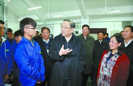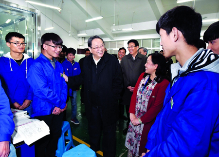 【场景二】:俞正声步入了机电工程系的实训车间。“首长好”!学生们掌声雷动,俞正声微笑着说“同学们好”。“你学费交了多少啊”?俞正声拉着15—3高机械1班杨兰钰的手问道,“我不知道,是我妈妈帮我交的,她刷的卡,我没看见”,“哈哈哈哈哈哈……”杨兰钰的一句话逗乐了在场的所有人。“那你一个月生活费多少”,“800元”,“800够吗?那可能要节约一点,你抽烟喝酒吗”?“没有,我不会抽烟喝酒”,“好!好!好!那你父亲是干什么的”?“他是工人”,“一个月工资多少”?“有事做的时候五千多,没事做的时候没有”,“不容易啊!” 俞正声听完杨兰钰的话后,转身面向全体学生说道:“同学们,你们对你学的专业了解吗?你们知道‘一招鲜,吃遍天’这句话吗?”“现在,大学生很多,但是高技能人才紧缺,我在上海的时候,上海中华造船厂里那么多人,只有15个人考得了国际焊接师,他们就是高技能人才,他们走到哪里都不怕,因此,同学们一定要认认真真学技术,踏踏实实干工作,要向这15个人学习。中国,现在不缺大学生,需要的是高技能的技工,因为高级工不多,许多工厂高级技工一万元一个月也招不到人,所以,同学们一定要把技术学好了、学精了,这样,不仅可以找到好的工作,还能减轻家庭负担,这是最好的对父母的报答”。“好,一定努力学习”,同学们大声回答着主席。随后,俞正声主席一一与学生握手,临出门时,还转身说道:“大家一定要好好学习,你们都很不错,要努力学”!俞正声微笑着向大家挥手。