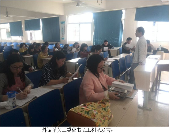 为了及时传达3月31日上午学院学工人员会议精神,全面推进系部各项学生工作,应用外语系全体学工人员于当天下午3点半在教学楼B401召开专门会议。学院关工委副主任田国荣,外语系关工委主任罗时勇、办公室主任谢东篱出席会议。