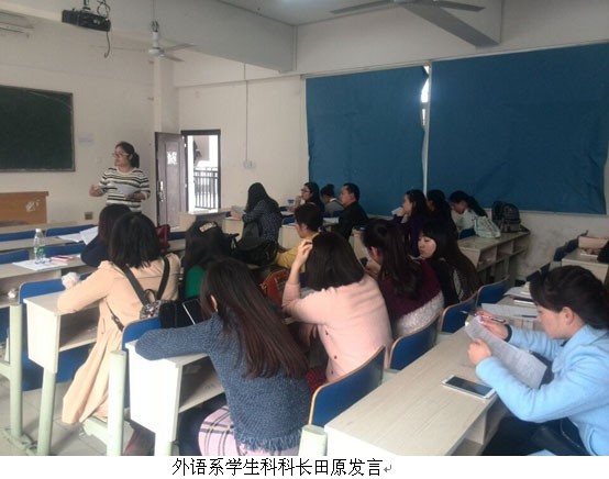二、外语系学生科科长田原先是反馈了学院及本系的保生工作、三月份校风学风检查结果,对学院近期开展的“禁烟、课堂手机规范放置评优” 活动要求进行了详细讲解,要求系部各班认真、积极对待。此外,还特别强调了该系的安全教育工作,要求班主任针对本系女生为主的特点,注意培养女生的自我保护意识;总结了该系目前仍然存在的问题,并结合本系具体情况拟定了与学院要求一致的活动方案以及措施,对每位学工人员提出了相关要求。