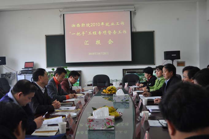 10 月 28 日 ,省教育厅毕业生信息中心副书记夏学军、湖南人文科技学院副院长谢祥清一行4人来我院,开展全省高校毕业生就业工作“一把手”工程专项督查。学院党委书记吴正有、院长李光寒、副院长罗红参加汇报会并作讲话。
