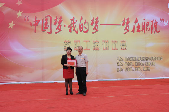 5月27日,学院中国梦·我的梦——梦在职院”(教职工组)演讲比赛在校园文化广场举行。学院副院长刘辉、院工会主席陈杨晖现场观看比赛并为获奖选手颁奖,学院纪委书记刘修洪为本次比赛作致辞。活动由院宣传处、院工会、基础课部等部门承办。