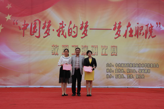 15参赛选手分别代表各自的工会小组参加比赛。演讲中,他们用优美的语言自己真挚感情抒发中国梦的理解,并结合自身经历,叙述自己内心深处的梦想,质朴地表达出职院人献身教育、甘于清贫、愿为人梯真实情感,了现场观众的强烈共鸣热烈掌声。演讲环节结束后,来自吉首大学的评委胡炳章教授对本次比赛作出点评,他赞扬了选手们的满腔激情以及比赛的精彩表现,同时也指出了选手在本次比赛的不足之处。在统分阶段,院工会的贺昌兴老师为在场观众带来歌曲《最美的歌唱给妈妈》,深情的演唱再次把活动推向又一个高潮