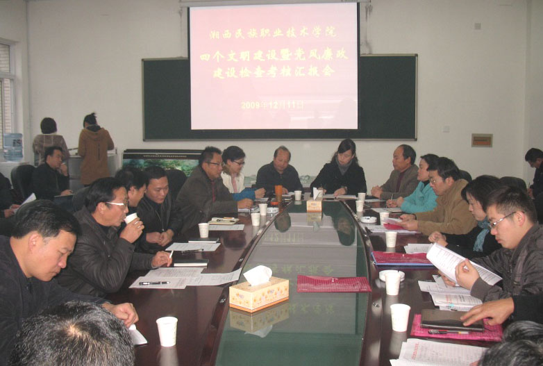 1211日,以州委宣传部副部长唐镜为组长的州委、州直工委检查组一行来到学院,检查2009年学院落实四个文明建设暨党风廉政建设情况。学院院长李光寒主持汇报会。学院党委副书记、副院长龚光耀向检查组汇报了学院开展四个文明建设和落实党风廉政建设情况。2009年是学院进一步整合教育资源、扩大办学规模的一年,也是学院新校区初步建成、实现部分搬迁的一年,更是学院四个文明和社会建设工作纵深开展、硕果累累的一年。在州委、州政府和省教育厅的领导下,学院始终坚持“依法治院”和“道德立院”相结合的战略方针,紧紧围绕一个中心(又好又快发展这一中心),突出两个重点(教学工作和思政工作),依托三种策略(以人为本,构建和谐校园;以廉为本,打造一流班子;以严为本,落实各项工作),狠抓四项建设(物质文明建设、精神文明建设、政治文明建设、生态文明建设),以学习实践科学发展观为主线贯彻全年工作,结合州委、州政府关于四个文明和社会建设目标管理考核条目的要求,积极探索四个文明和社会建设的新方法和新途径,取得了突出的成绩,得到了上级领导的充分肯定和社会各界的良好评价。